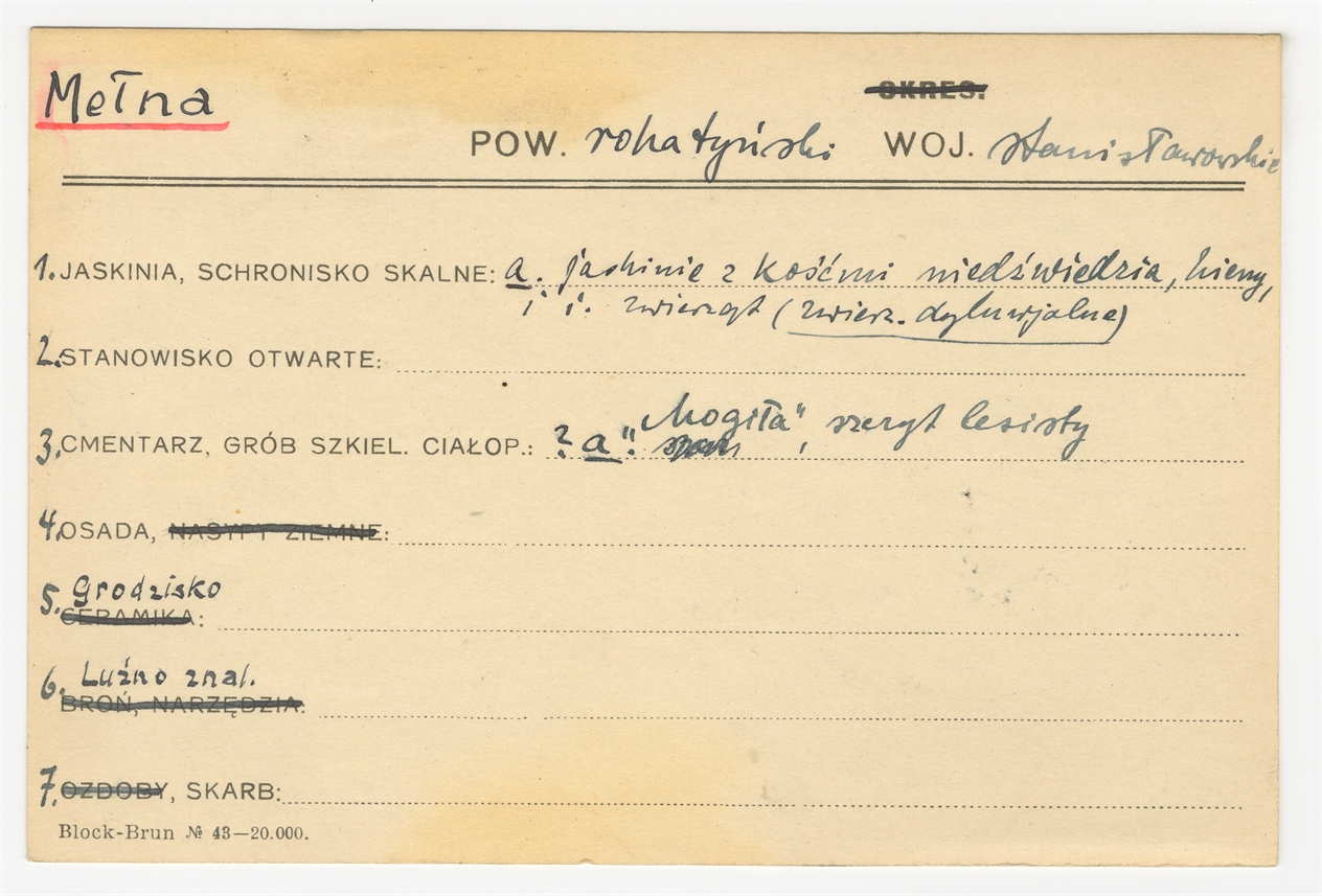 Karta stanowiska "Mełna pow. rohatyński woj. stanisławowskie" (druk rękopis) - strona 1