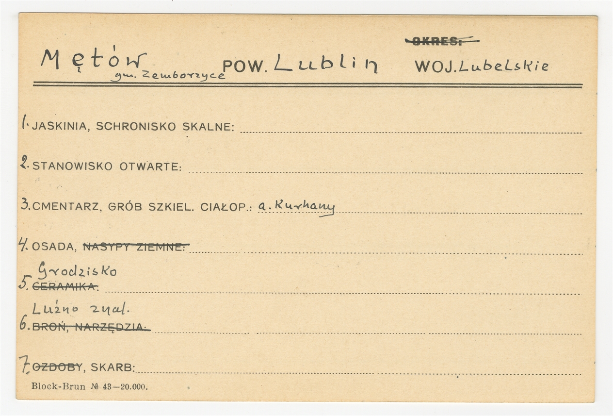 Karta stanowiska "Mętów gm. Zemborzyce pow. Lublin woj. Lubeskie" (druk rękopis) - strona 1