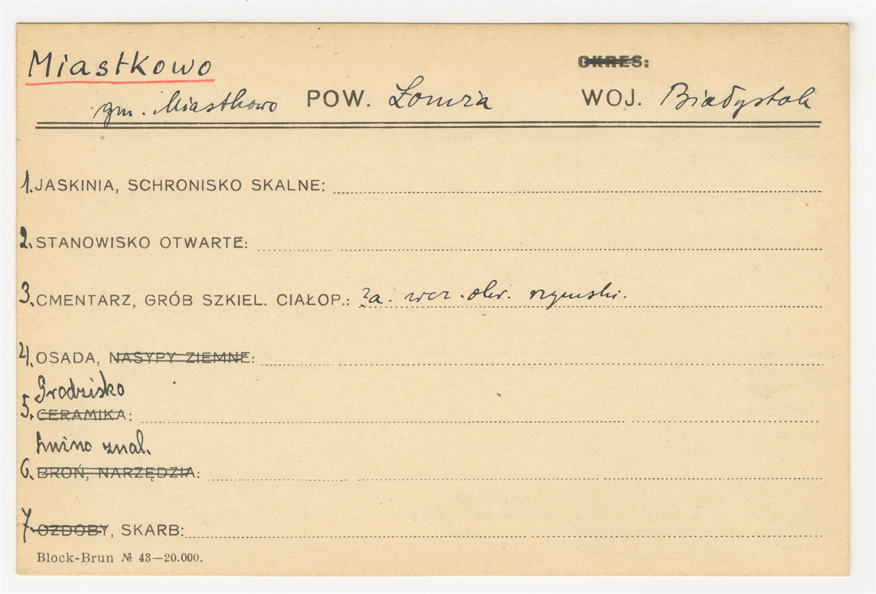 Karta stanowiska "Miastkowo gm. Miastkowo pow. Łomża woj. Białystok" (druk rękopis) - strona 1