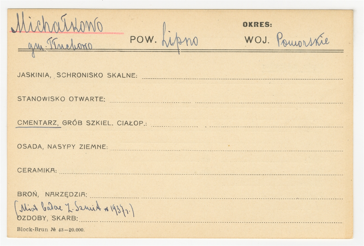 Karta stanowiska "Michałkowo gm. Tłuchowo pow. Lipno woj. Pomorskie" (druk rękopis) - strona 1