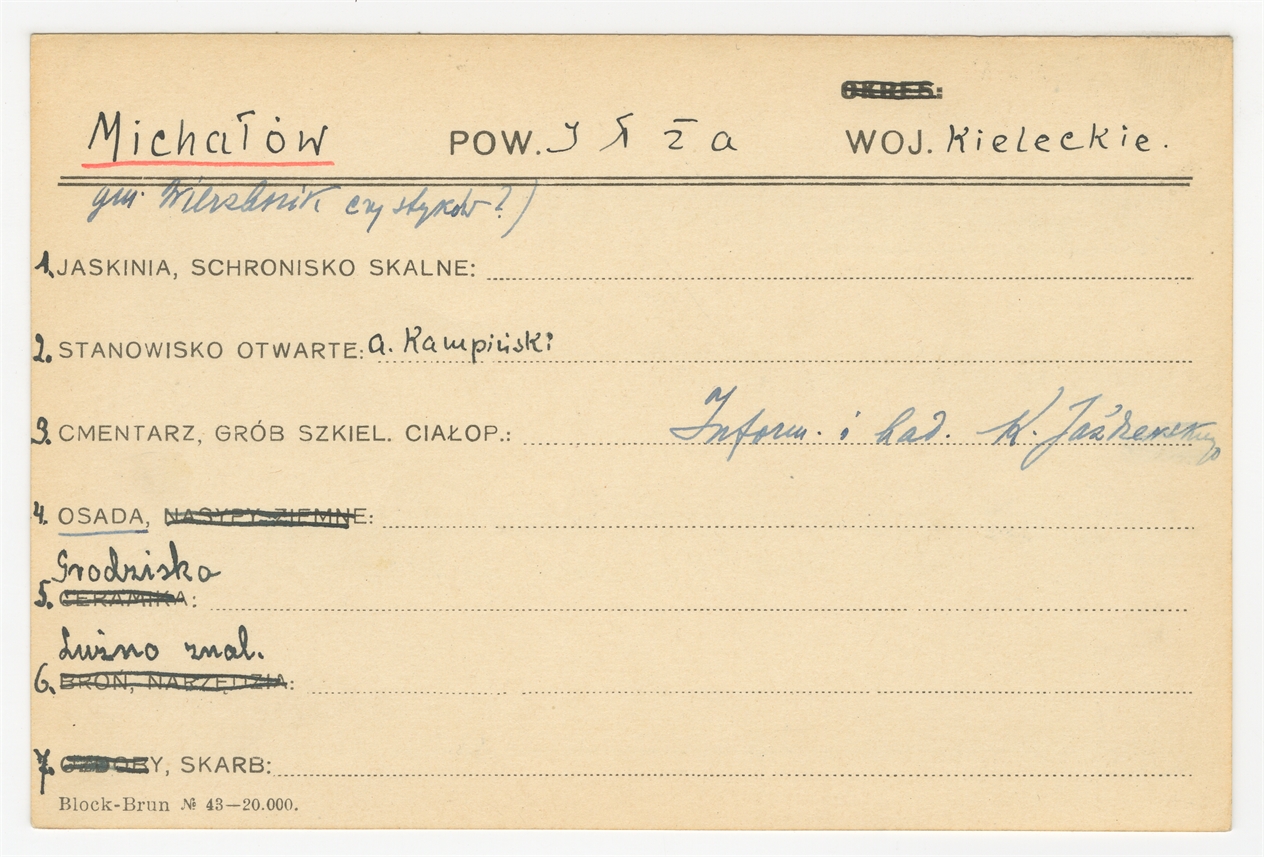 Karta stanowiska "Michałów gm. Wierabnik czy Styków? pow. Iłża woj. Kieleckie" (druk rękopis) - strona 1