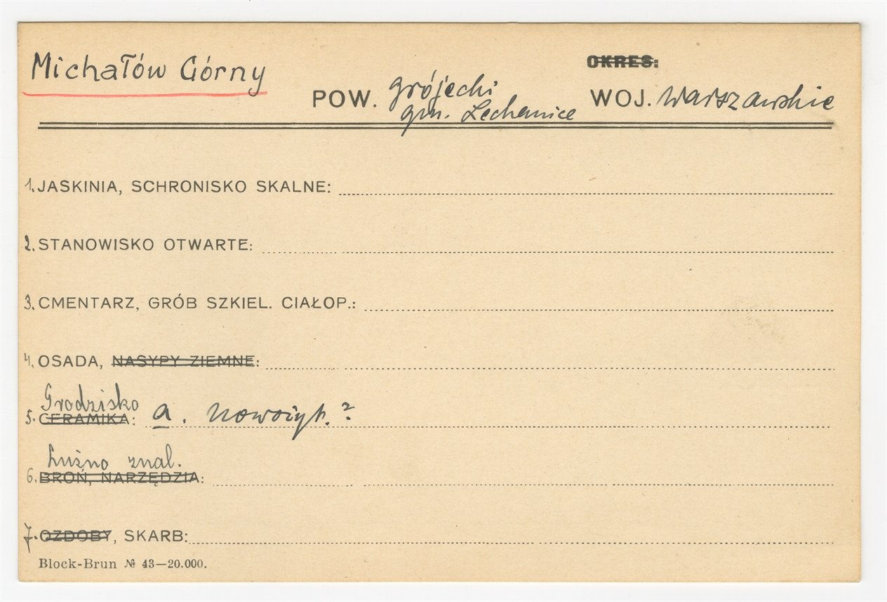 Karta stanowiska "Michałów Górny gm. Lechanice pow. Grójecki woj. warszawskie" (druk rękopis) - strona 1