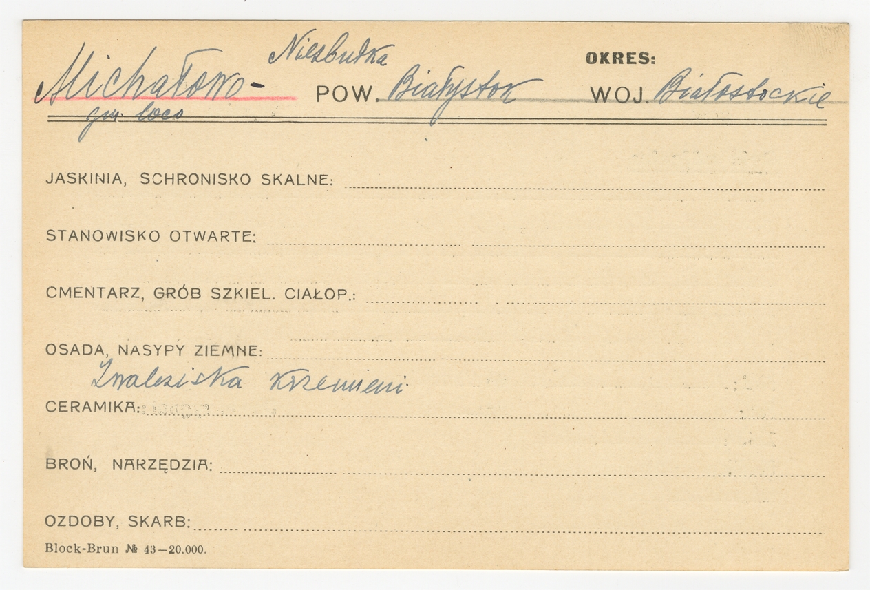 Karta stanowiska "Michałowo-Niezbudka gm. loco pow. Białystok woj. Białostockie" (druk rękopis) - strona 1