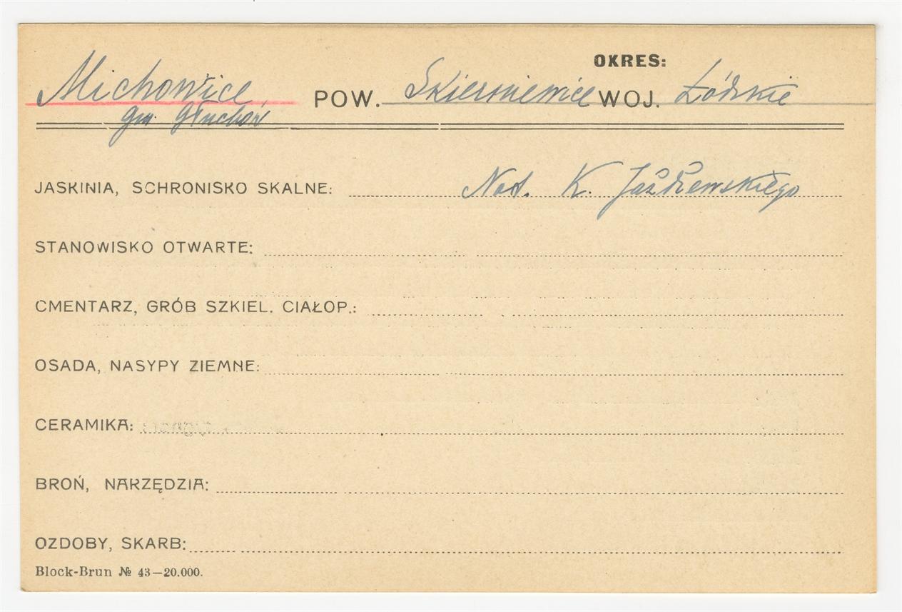 Karta stanowiska "Michowice gm. Głuchów pow. Skierniewice woj. Łódzkie" (druk rękopis) - strona 1