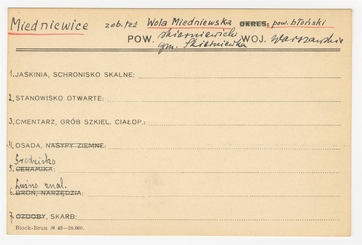 Karta stanowiska "Miedniewice gm. Skierniewka pow. Skierniewicki woj. Warszawskie" (druk rękopis) - strona 1