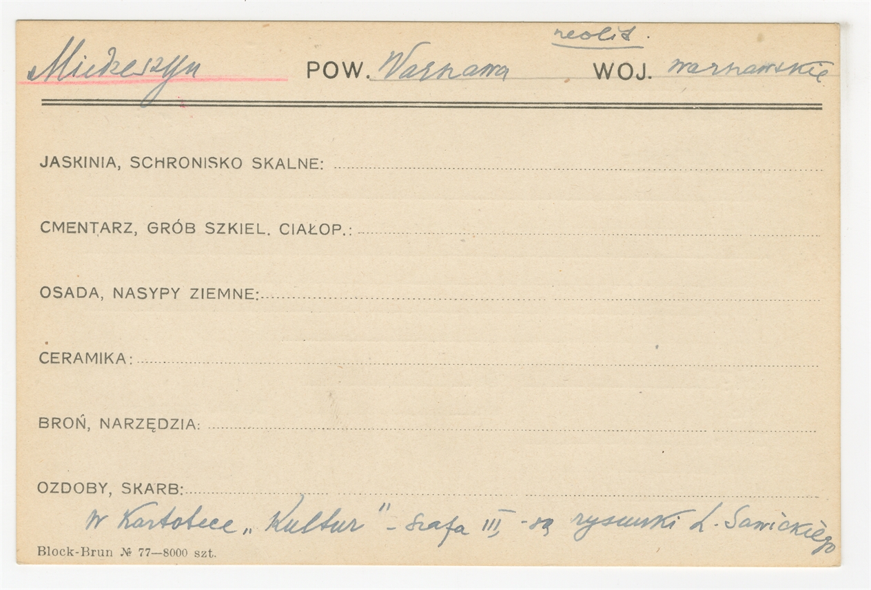 Karta stanowiska "Miedzeszyn pow. Warszawa woj. warszawskie" (druk rękopis) - strona 1