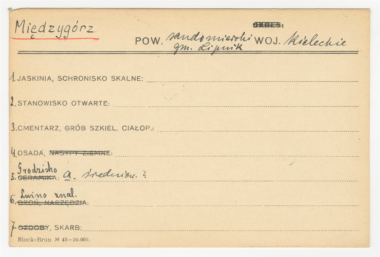 Karta stanowiska "Międzygórz gm. Lipnik pow. sandomierski woj. Kieleckie" (druk rękopis) - strona 1