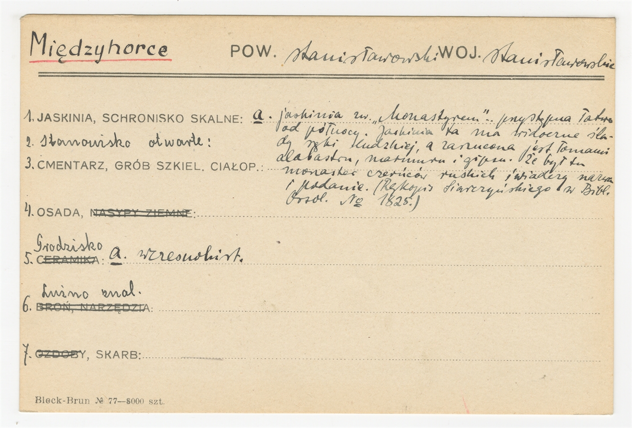Karta stanowiska "Międzyhorce pow. stanisławowski woj. stanisławowskie" (druk rękopis) - strona 1