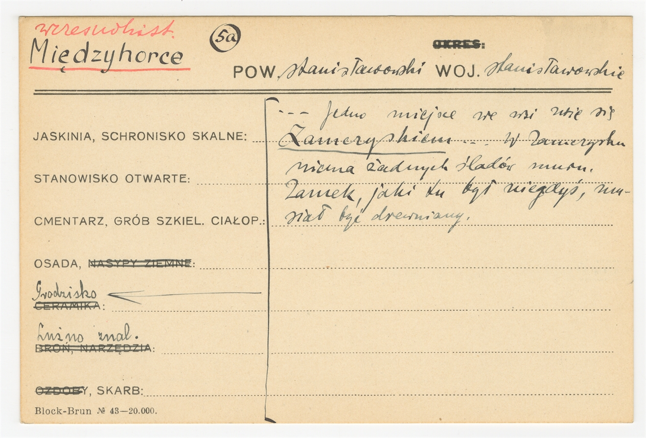 Karta stanowiska "Międzyhorce pow. stanisławowski woj. stanisławowskie" (druk rękopis) - strona 1