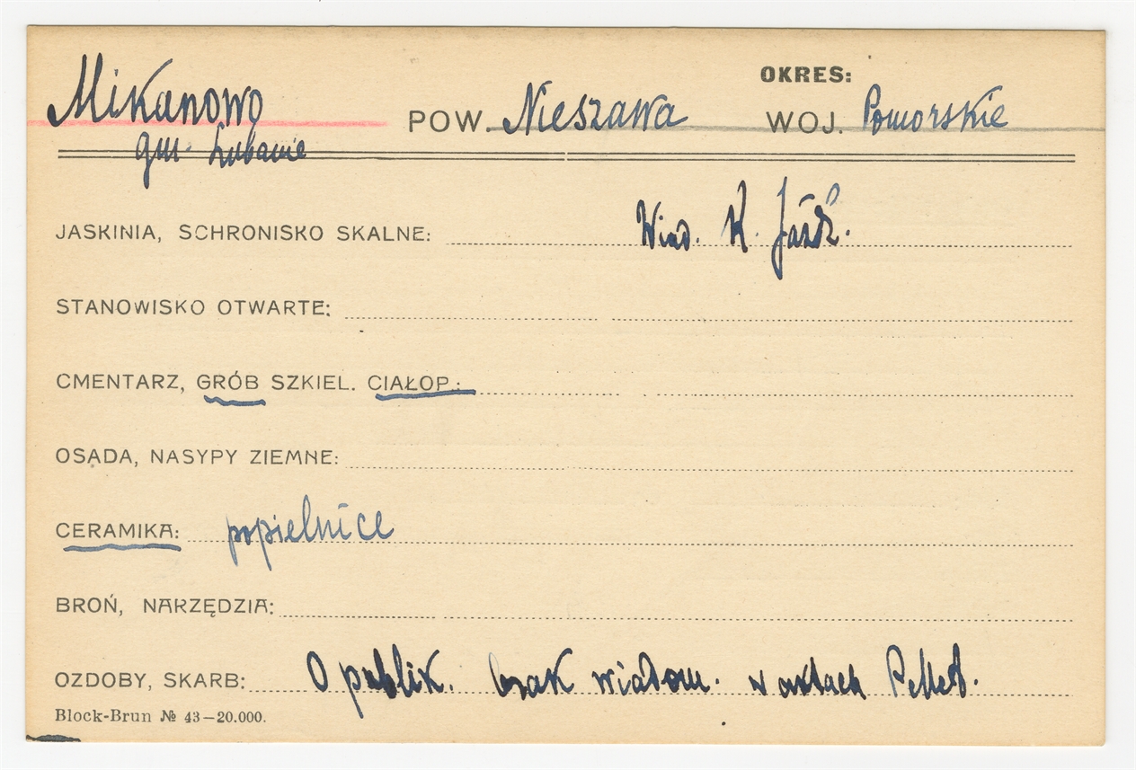 Karta stanowiska "Mikanowo gm. Lubanie pow. Nieszawa woj. Pomorskie" (druk rękopis) - strona 1