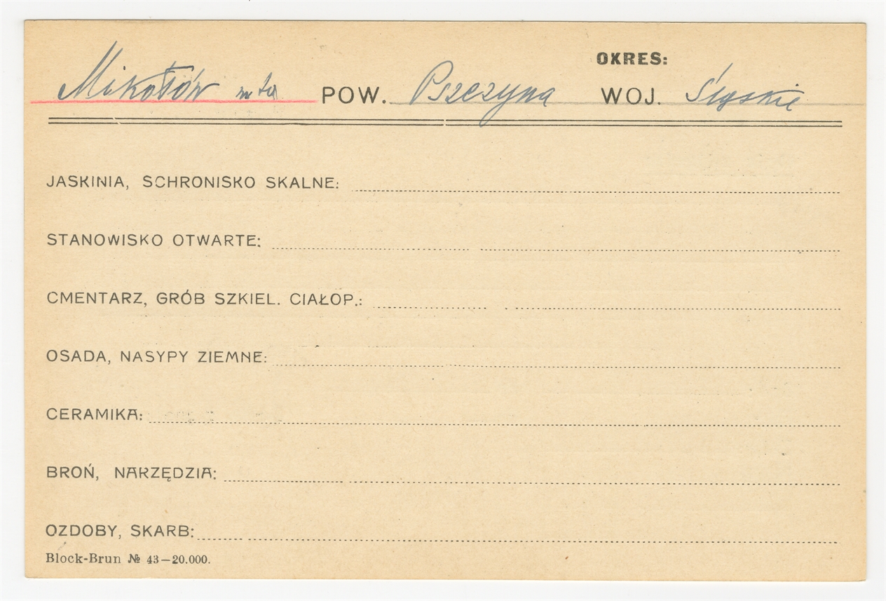 Karta stanowiska "Mikołów pow. Pszczyna woj. Śląskie" (druk rękopis) - strona 1