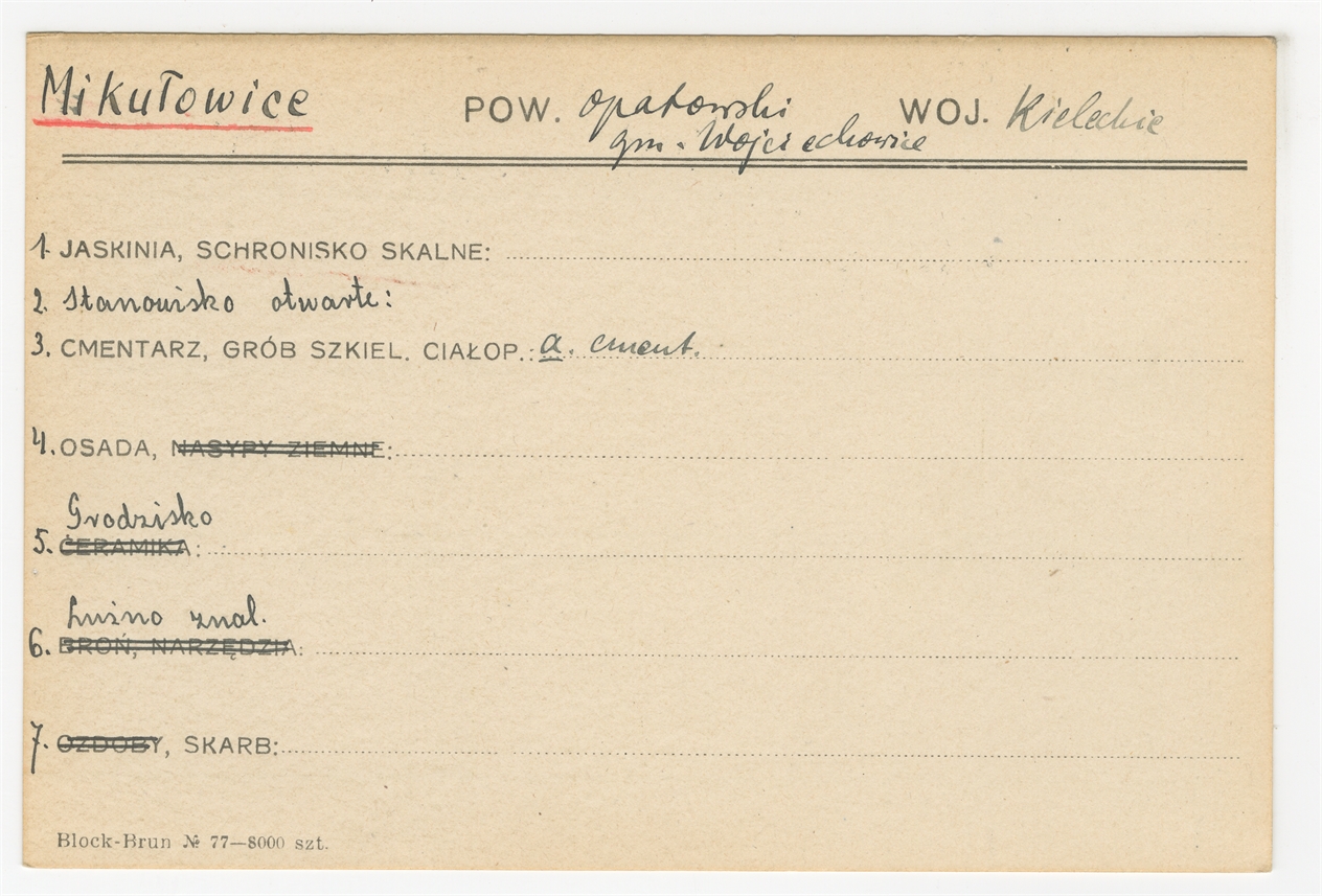 Karta stanowiska "Mikułowice gm. Wojciechowice pow. opatowski woj. Kieleckie" (druk rękopis) - strona 1