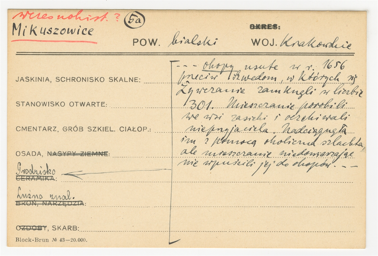 Karta stanowiska "Mikuszowice pow. bialski woj. Krakowskie" (druk rękopis) - strona 1