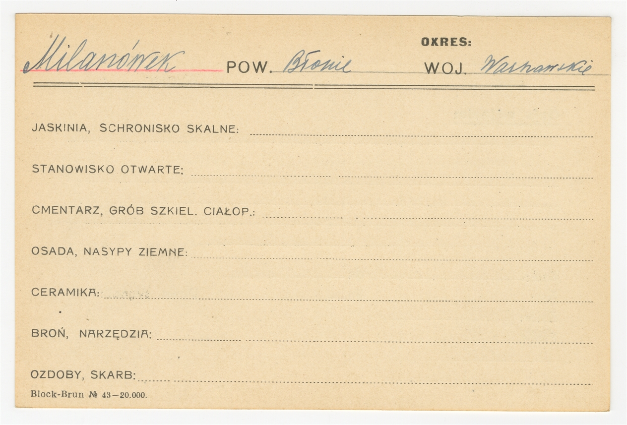 Karta stanowiska "Milanówek pow. Błonie woj. Warszawskie" (druk rękopis) - strona 1