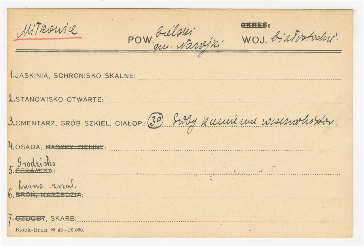 Karta stanowiska "Miłkowice gm. Narojki pow. bielski woj. białostockie" (druk rękopis) - strona 1