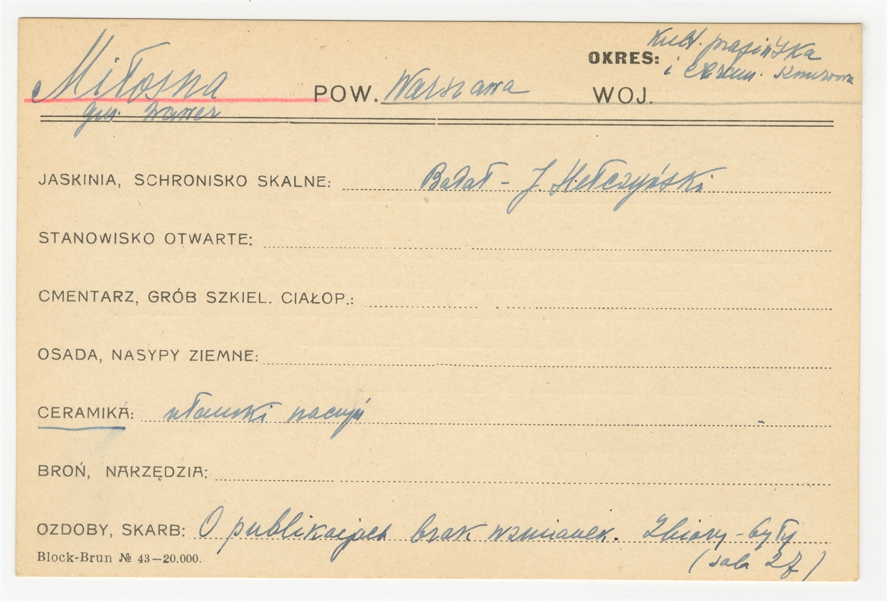 Karta stanowiska "Miłosna gm. Wawer pow. Warszawa" (druk rękopis) - strona 1