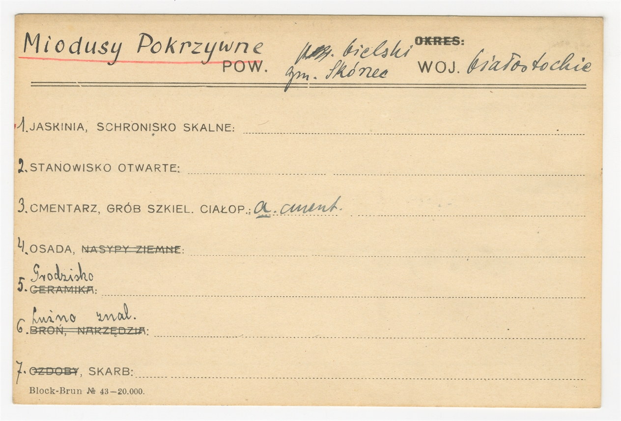 Element 1 - Karta stanowiska "Miodusy Pokrzywne gm. Skórzec pow. bielski woj. biaostockie" (druk rękopis) - strona 1