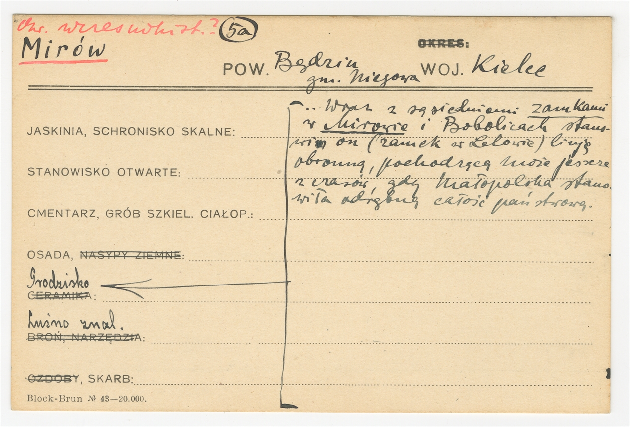 Karta stanowiska "Mirów gm. Niegowa pow. Będzin woj. Kielce" (druk rękopis) - strona 1