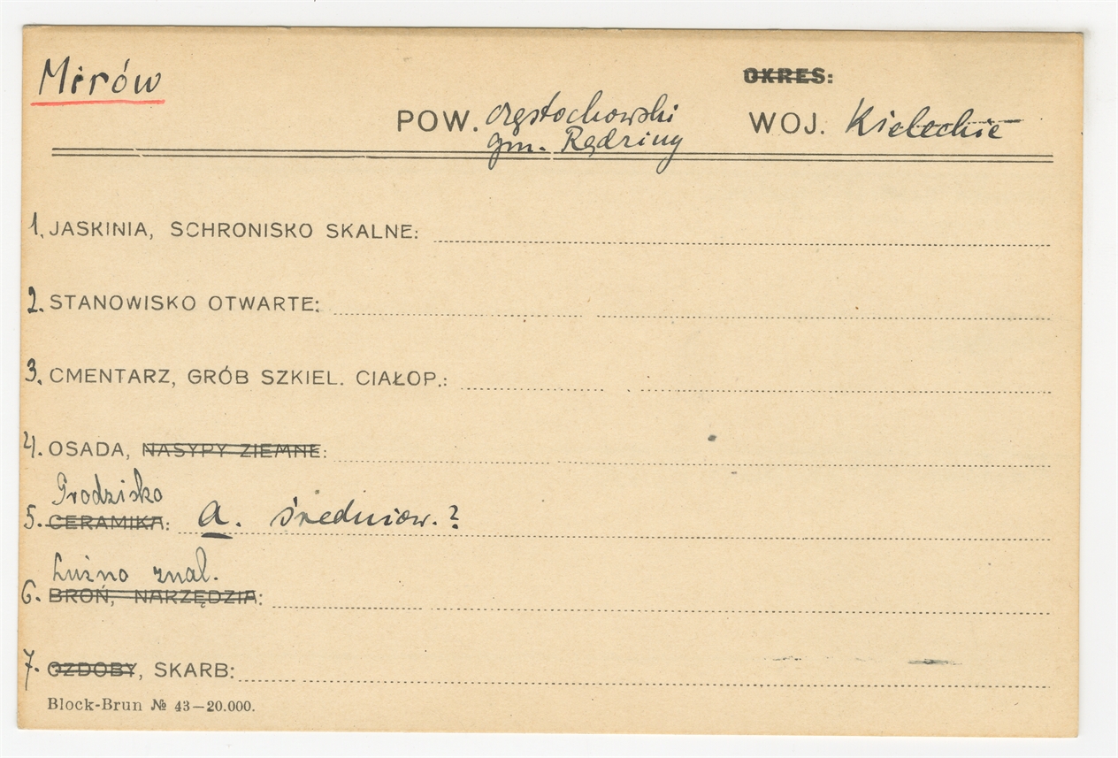 Karta stanowiska "Mirów gm. Rędziny pow. częstochowski woj. Kieleckie" (druk rękopis) - strona 1