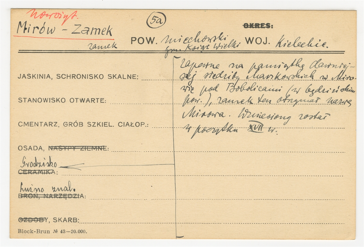 Karta stanowiska "Mirów-Zamek gm. Książ Wielki pow. miechowski woj. Kieleckie" (druk rękopis) - strona 1