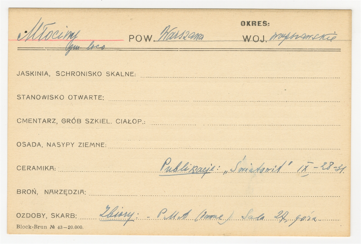 Karta stanowiska "Młociny gm. loco pow. Warszawa woj. warszawskie" (druk rękopis) - strona 1