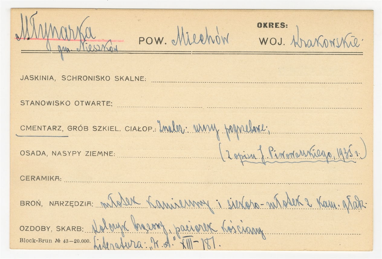 Karta stanowiska "Młynarka gm. Nieszków pow. Miechów woj. Krakowskie" (druk rękopis) - strona 1