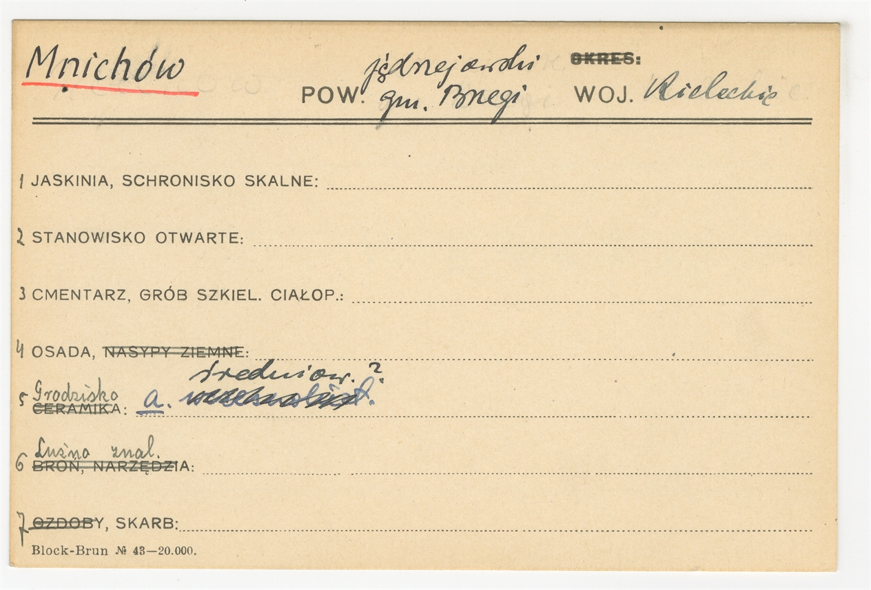Element 1 - Karta stanowiska "Mnichów gm. Brzegi pow. jędrzejowski woj. Kieleckie" (druk rękopis) - strona 1
