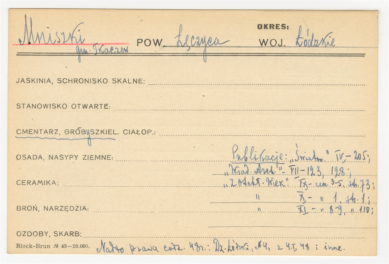 Karta stanowiska "Mniszki gm. Tkaczew pow. Łęczyca woj. Łódzkie" (druk rękopis) - strona 1