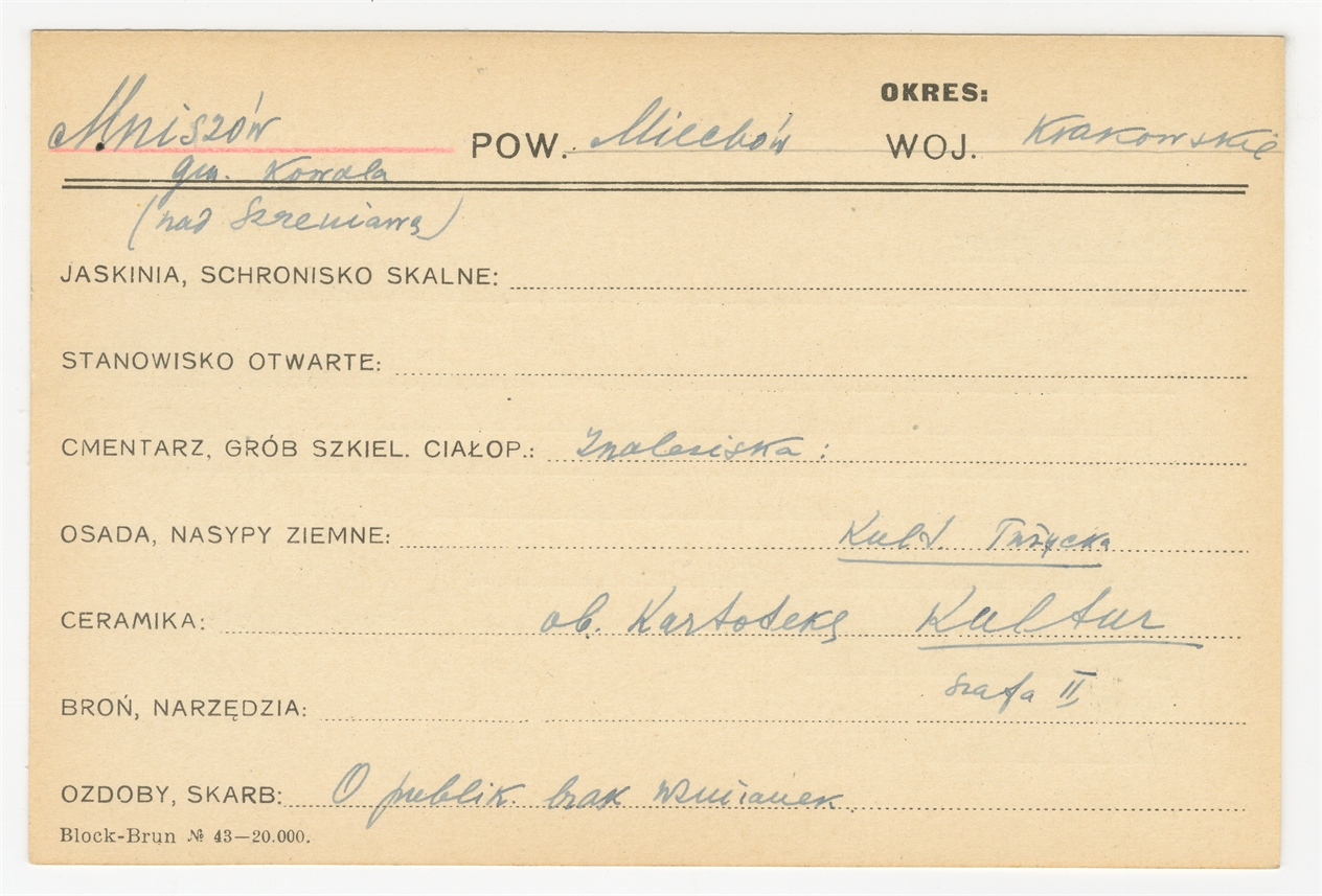 Karta stanowiska "Mniszów gm. Kowala pow. Miechów woj. Krakowskie" (druk rękopis) - strona 1
