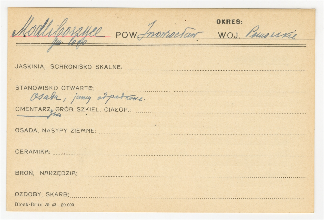 Karta stanowiska "Modliborzyce gm. loco pow. Inowrocław woj. Pomorskie" (druk rękopis) - strona 1