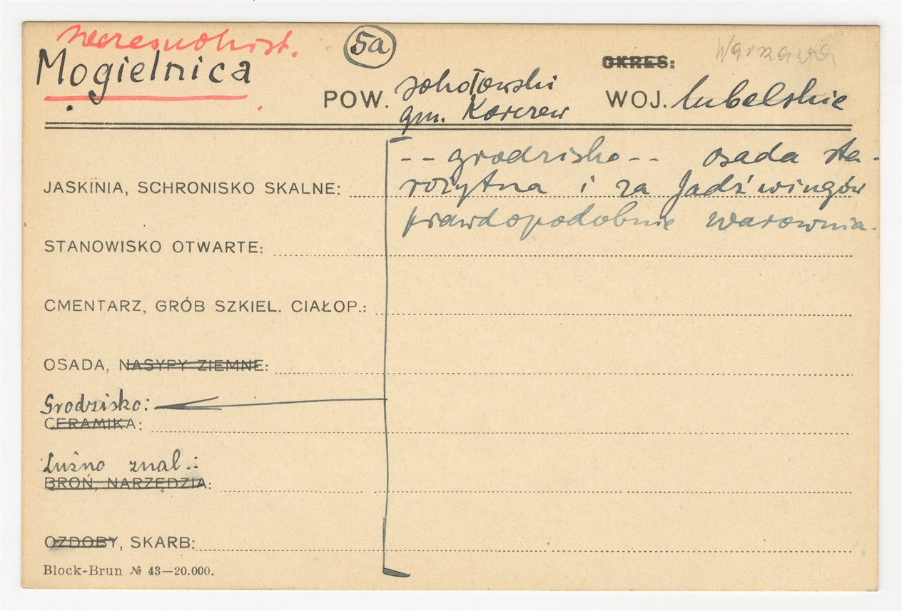 Karta stanowiska "Mogielnica gm. Korczew pow. sokołowski woj. lubelskie" (druk rękopis) - strona 1