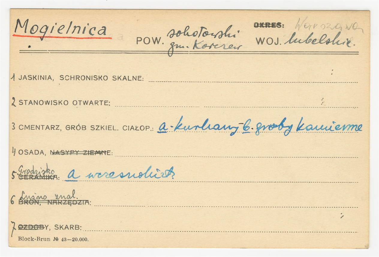 Karta stanowiska "Mogielnica gm. Korczew pow. sokołowski woj. lubelskie" (druk rękopis) - strona 1