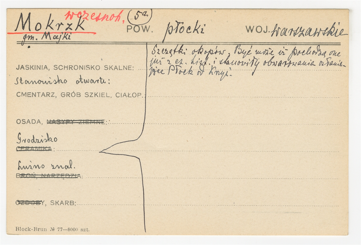 Karta stanowiska "Mokrzk gm. Majki pow. płocki woj. Warszawskie" (druk rękopis) - strona 1