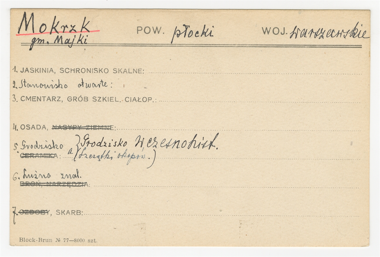Karta stanowiska "Mokrzk gm. Majki pow. płocki woj. Warszawskie" (druk rękopis) - strona 1