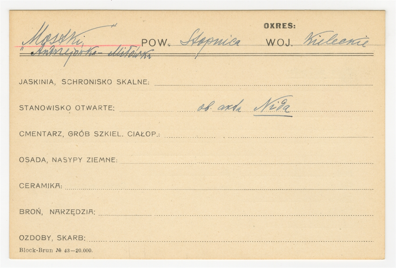 Karta stanowiska "Mostki" Andrzejówka-Miłówka pow. Stopnica woj. Kieleckie" (druk rękopis) - strona 1