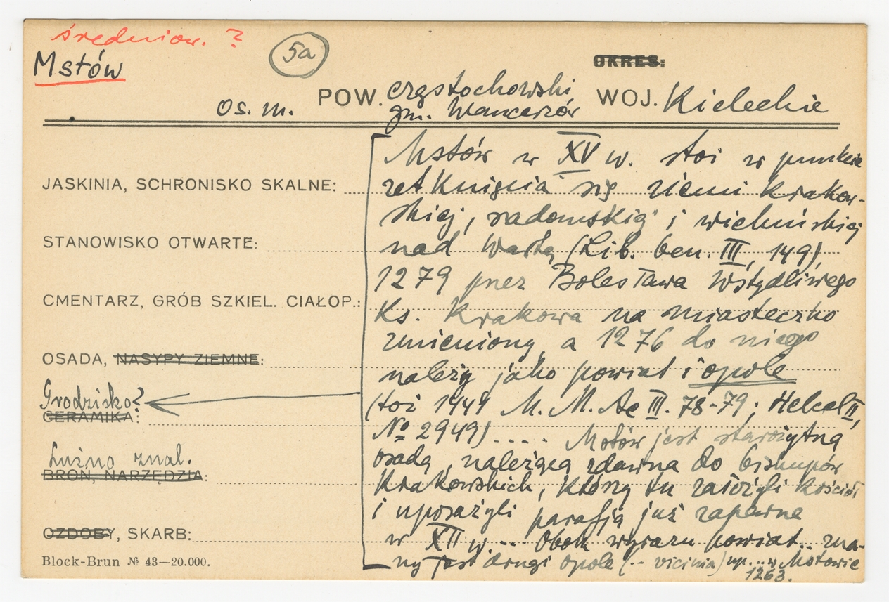 Karta stanowiska "Mstów gm. Wancerzów pow. częstochowski woj. Kieleckie" (druk rękopis) - strona 1