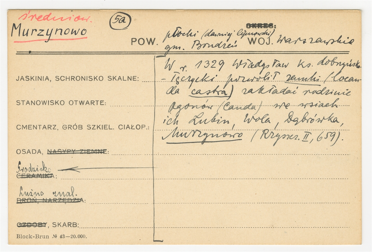 Karta stanowiska "Murzynowo gm. Brudzeń pow. płocki (dawniej lipnowski) woj. Warszawskie" (druk rękopis) - strona 1