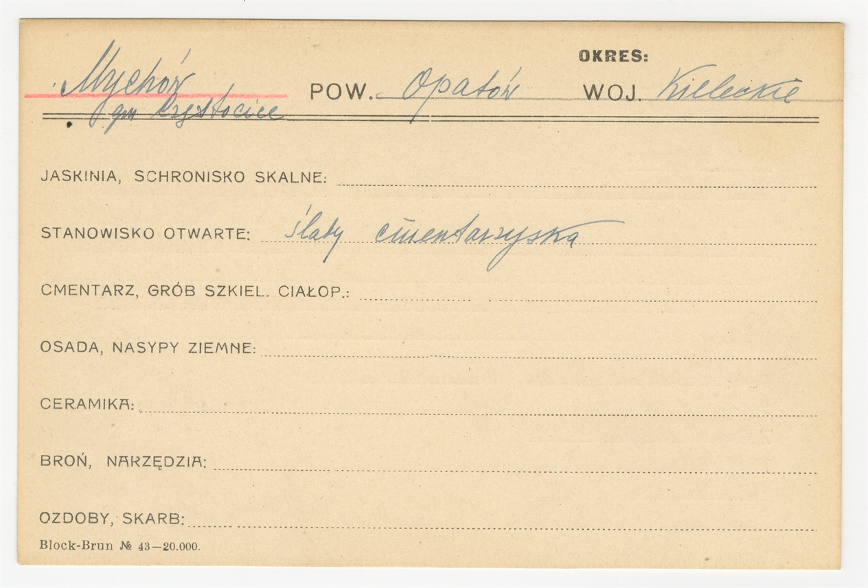 Karta stanowiska "Mychów gm. Częstocice pow. Opatów woj. Kieleckie" (druk rękopis) - strona 1