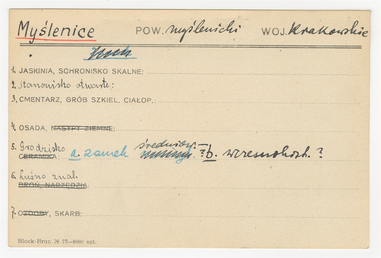 Karta stanowiska "Myślenice pow. myślenicki woj. Krakowskie" (druk rękopis) - strona 1