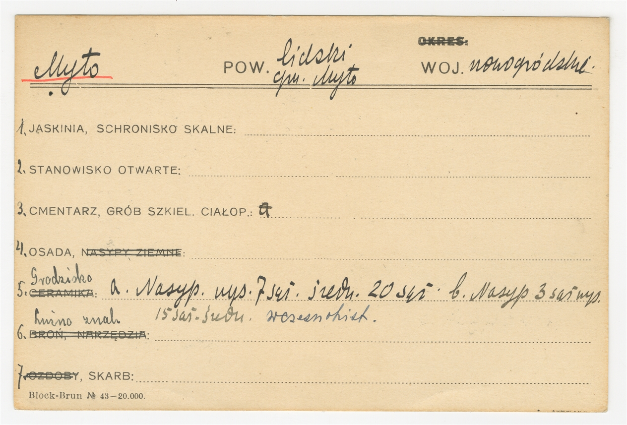 Karta stanowiska "Myto gm. Myto pow. lidzki woj. nowogródzkie" (druk rękopis) - strona 1
