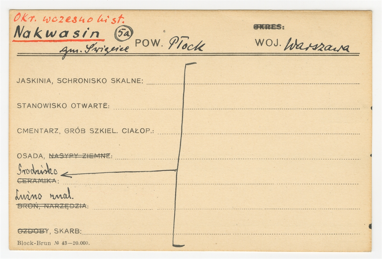 Karta stanowiska "Nakwasin gm. Święcice pow. Płock woj. Warszawa" (druk rękopis) - strona 1