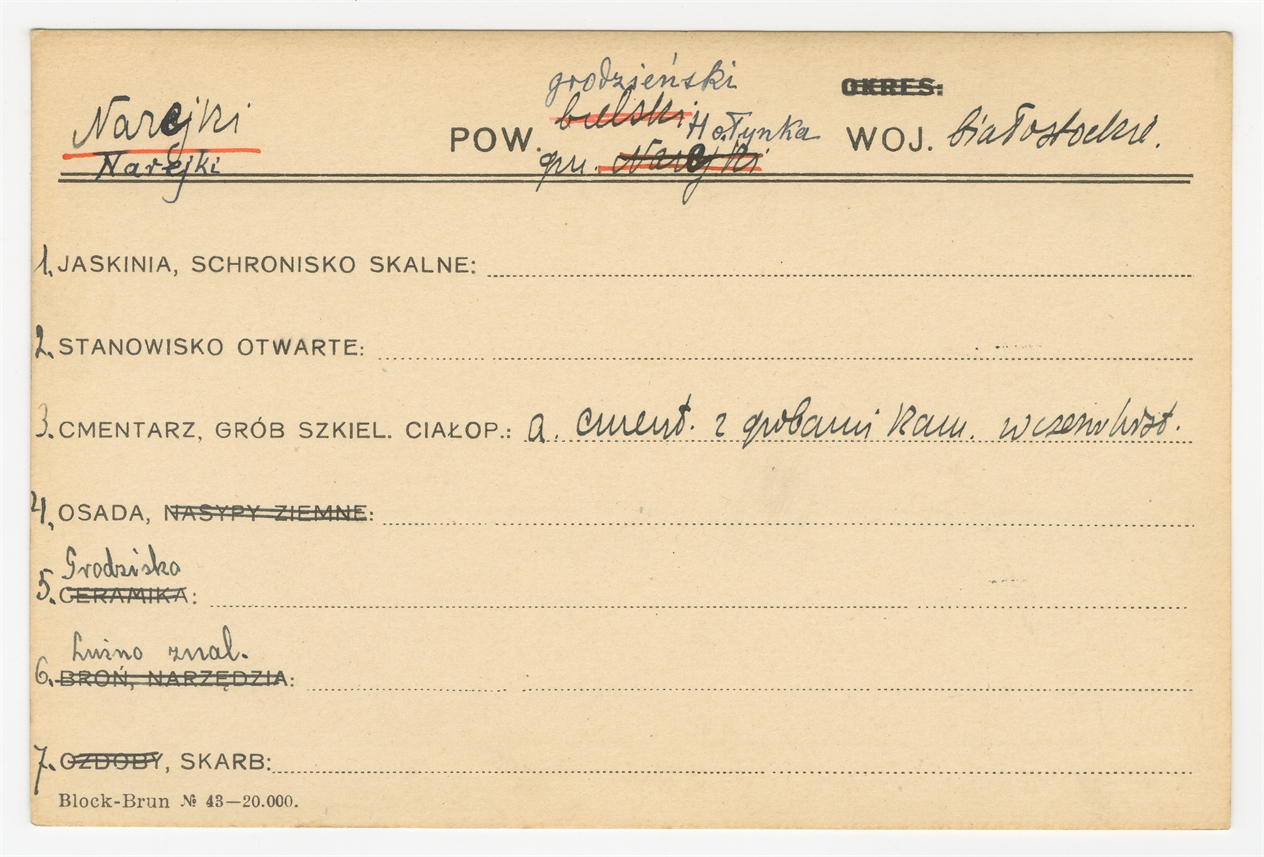 Karta stanowiska "Narejki gm. Hołynka pow. grodzieński woj. białostockie" (druk rękopis)