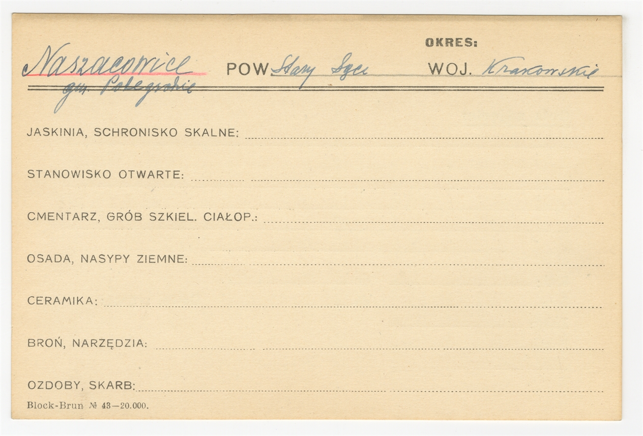 Karta stanowiska "Naszacowice gm. Polegrabie (?) pow. Stary Sącz woj. Krakowskie" (druk rękopis) - strona 1