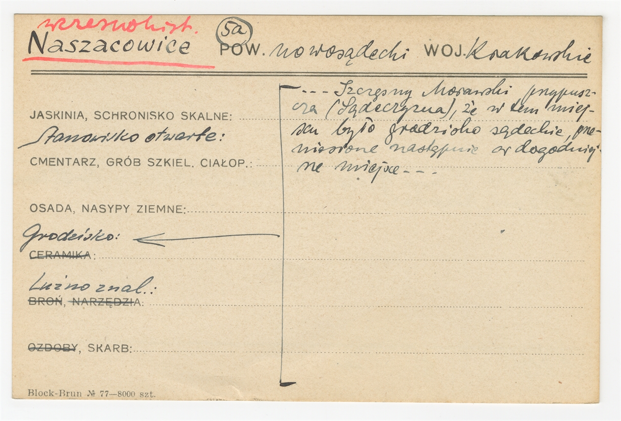 Karta stanowiska "Naszacowice pow. nowosądecki woj. Krakowskie" (druk rękopis) - strona 1