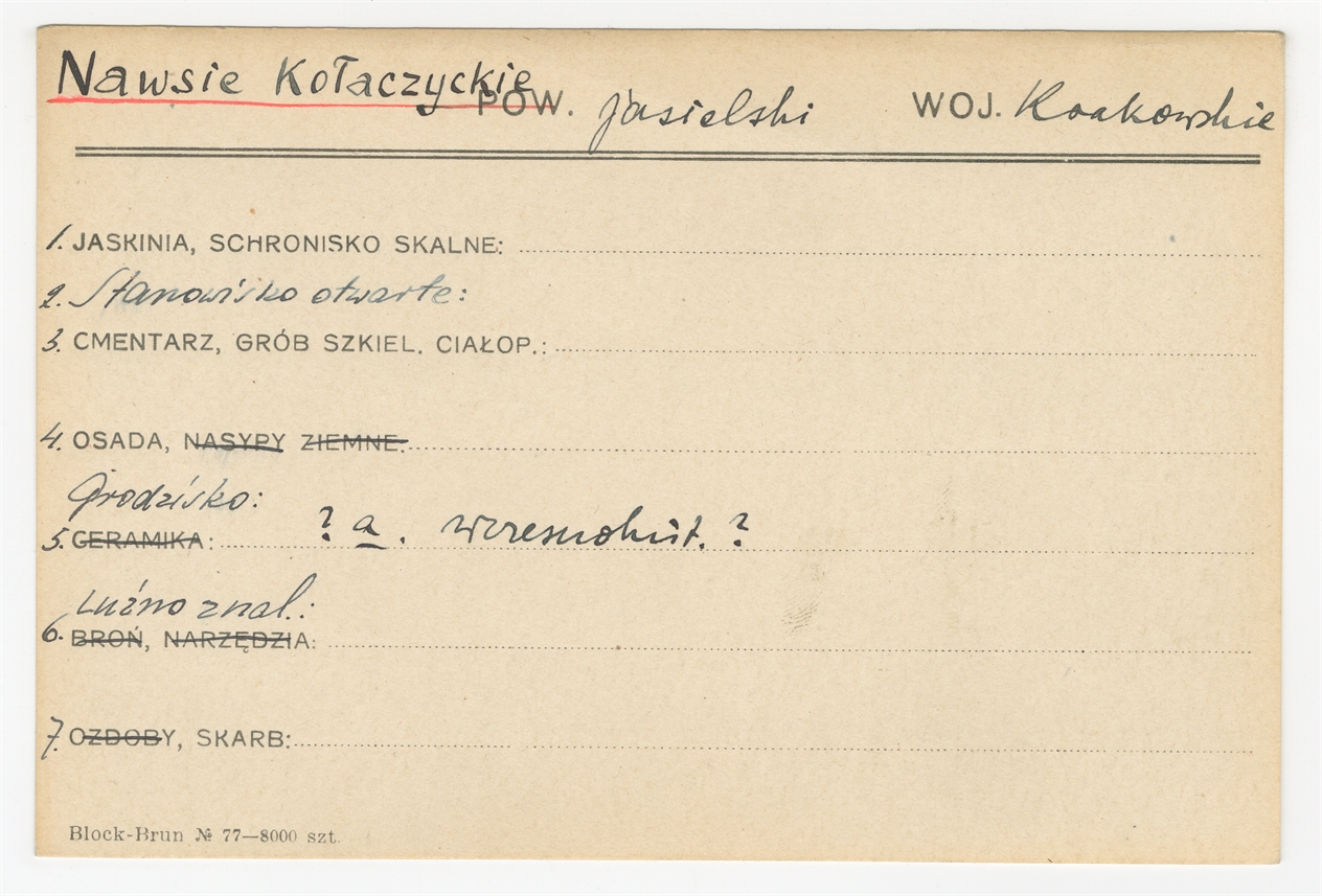Karta stanowiska "Nawsie Kołaczyckie pow. jasielski woj. Krakowskie" (druk rękopis) - strona 1