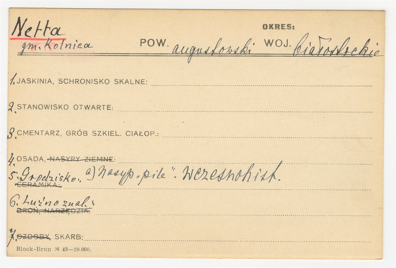 Karta stanowiska "Netta gm. Kolnica pow. augustowski woj. białostockie" (druk rękopis) - strona 1