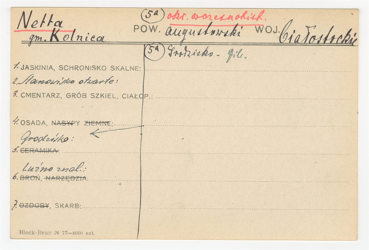 Karta stanowiska "Netta" gm. Kolnica pow. augustowski woj. białostockie" (druk rękopis) - strona 1