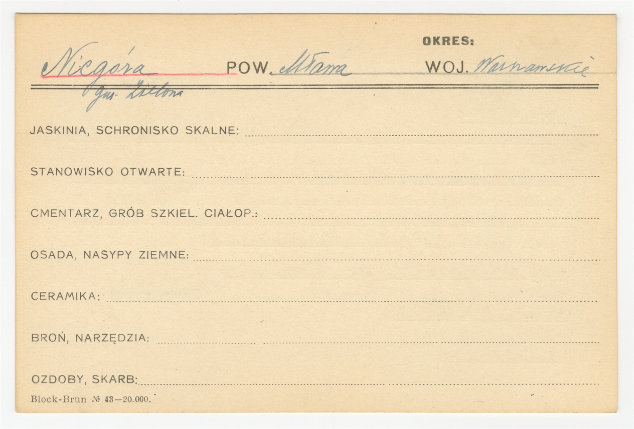 Karta stanowiska "Nicgóra gm. Zielona pow. Mława woj. Warszawskie" (druk rękopis) - strona 1