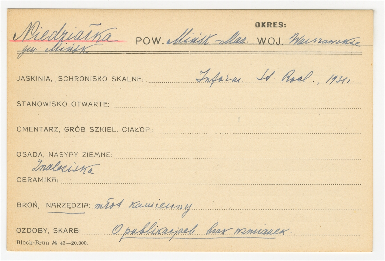 Karta stanowiska "Niedziałka gm. Mińsk pow. Mińsk Maz. woj. Warszawskie" (druk rękopis) - strona 1