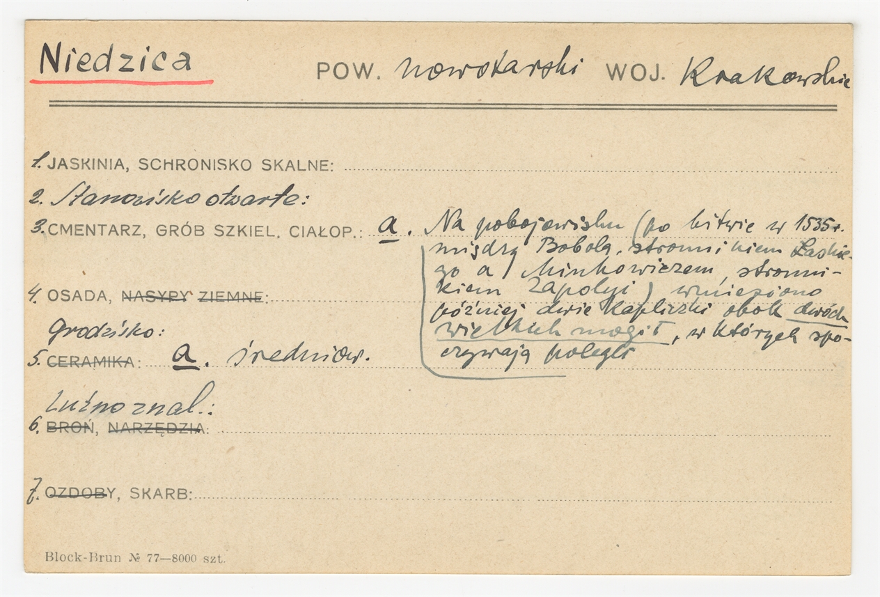 Karta stanowiska "Niedzica pow. nowotarski woj. Krakowskie" (druk rękopis) - strona 1